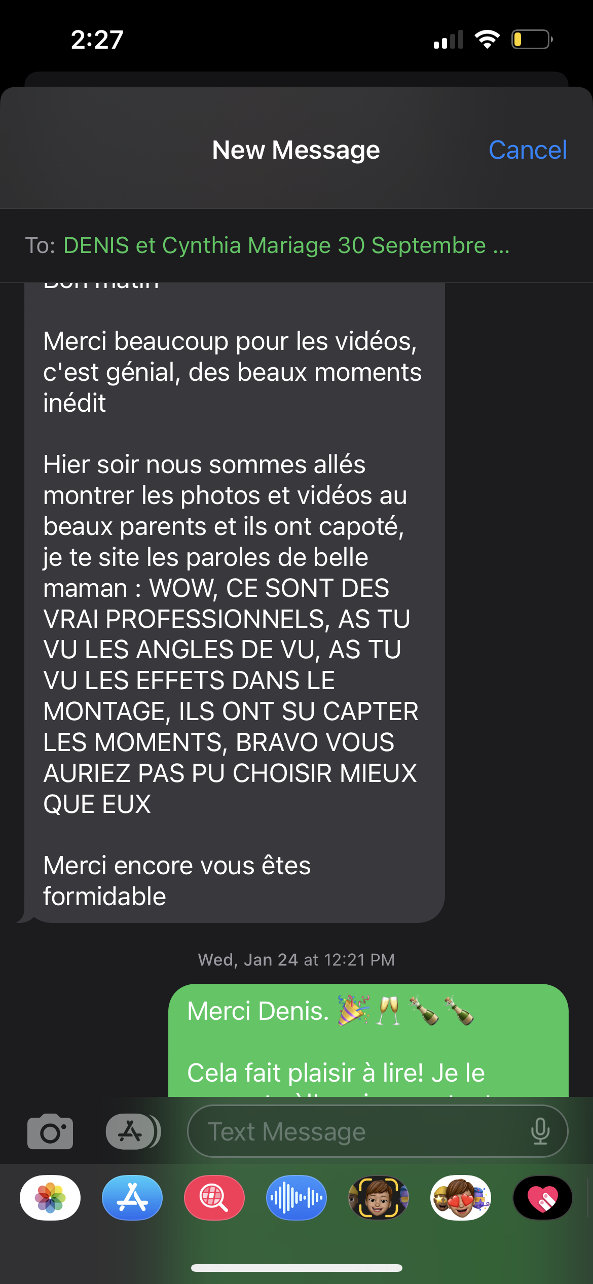 “Merci beaucoup pour les vidéos. Hier soir nous sommes allés montrer les photos et vidéos aux beaux-parents, ils ont capoté, je te site les paroles de belle-maman: WOW, CE SONT DES VRAIS PROFESSIONNELS, AS-TU VU LES ANGLES DE VUE, AS-TU VU LES EFFETS DANS LE MONTAGE, ILS ONT SU CAPTER LES MOMENTS, BRAVO! VOUS AURIEZ PAS PU CHOISIR MIEUX”